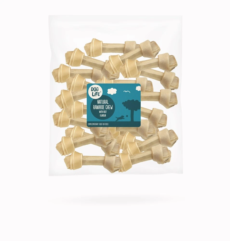 The Knotted Bone is lip-smackingly delicious with a yummy beefy aroma that will tickle your dog’s taste buds. The meaty smell will waft under your dog’s sensitive nose and cause it to twitch with joy. The texture and flavour will excite his senses and he will be one happy and contented dog. Dogs love to lick and nibble on tasty bones and chomping on the hard texture of the bone will help to remove tartar and plaque and keep your dog’s teeth and gums clean and healthy and will also ease the boredom that some dogs encounter.